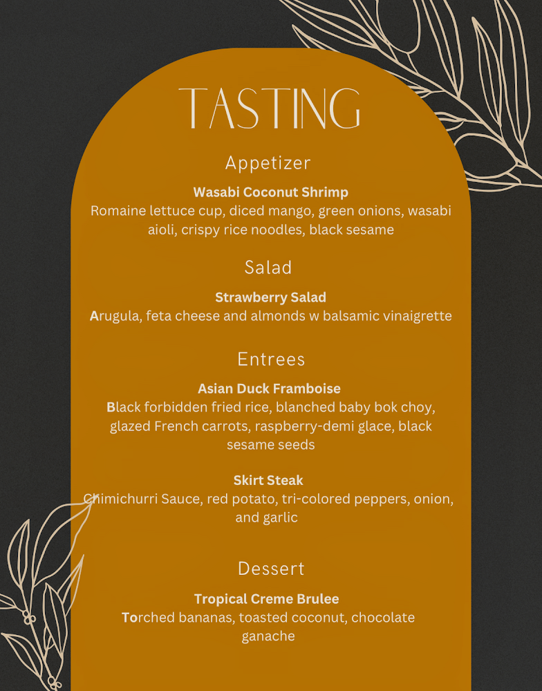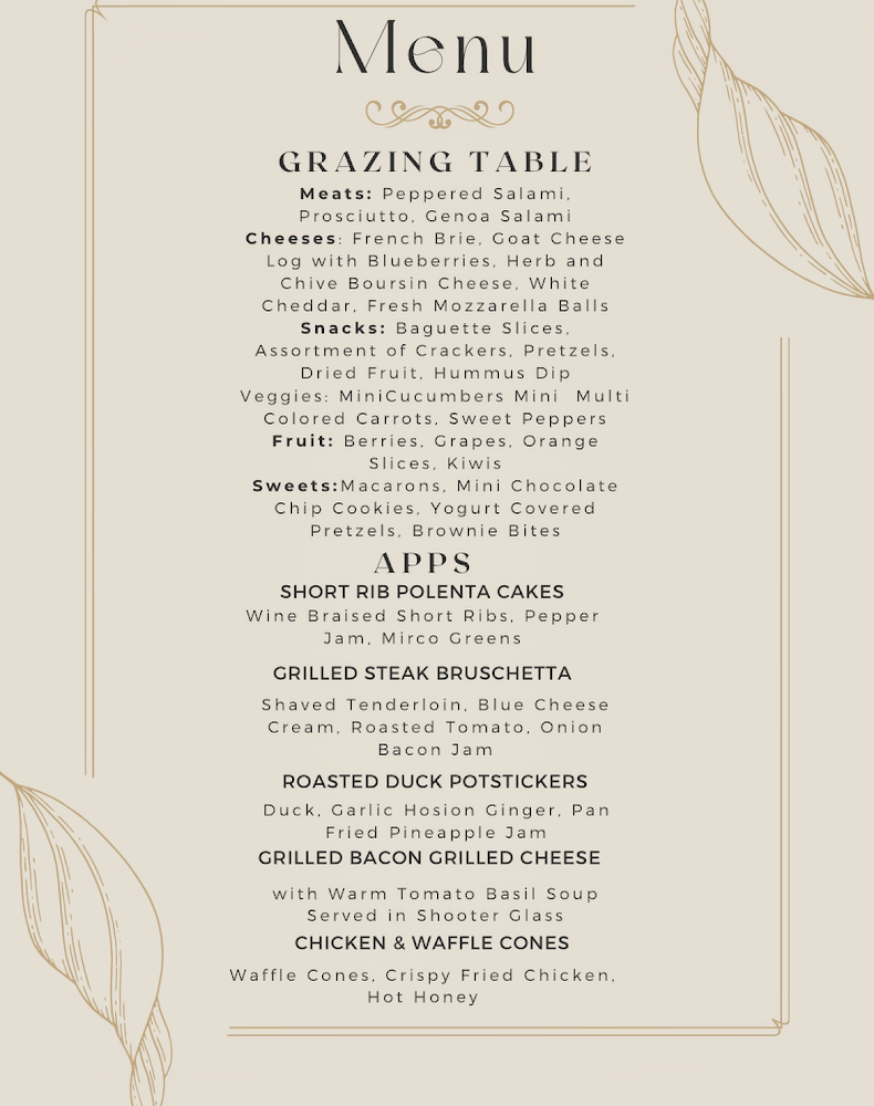 Here, you will find a curated selection of our culinary creations, designed to showcase the diversity and excellence of our offerings. Whether you're planning an intimate dinner, a lavish event, or seeking weekly meal inspiration, our sample menus provide a glimpse into the personalized and exquisite dining experiences we craft for our clients. Each menu is thoughtfully created with the finest ingredients, reflecting seasonal flavors and catering to a variety of tastes and dietary preferences. Explore our sample menus and let your culinary journey begin!